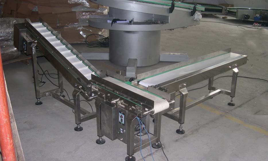 送100KG以下的物品或粉状、颗状物品,其运行高速、平稳,噪音低,并可以上下坡传送。